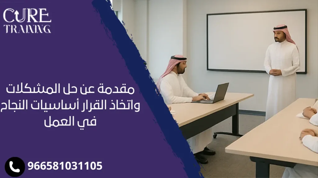 مقدمة عن حل المشكلات واتخاذ القرار، هي من أهم الموضوعات التي تحظى باهتمام كبير داخل المملكة العربية السعودية، حيث يواجه الأفراد العديد من المواقف في الحياة اليومية تتطلب القدرة على التفكير الجيد واتخاذ القرار المناسب، وبسبب تطور بيئة العمل والتعليم وإدارة الأعمال داخل السعودية أصبح من الضروري تعزيز مهارات حل المشكلات وصنع القرارات بشكل علمي ومنهجي، وهذا لضمان تحقيق النجاح والتفوق، فهذه المقدمة تعطي لنا معلومات عن أهمية امتلاك استراتيجيات واضحة حتى تساعدك على مواجهة المشكلات بثقة للوصول إلى أفضل الحلول، لذلك وفر لك مركز كيور للتدريب المعتمد أهم الدورات لحل المشكلات والمهارات الشخصية والتغلب عليها.
